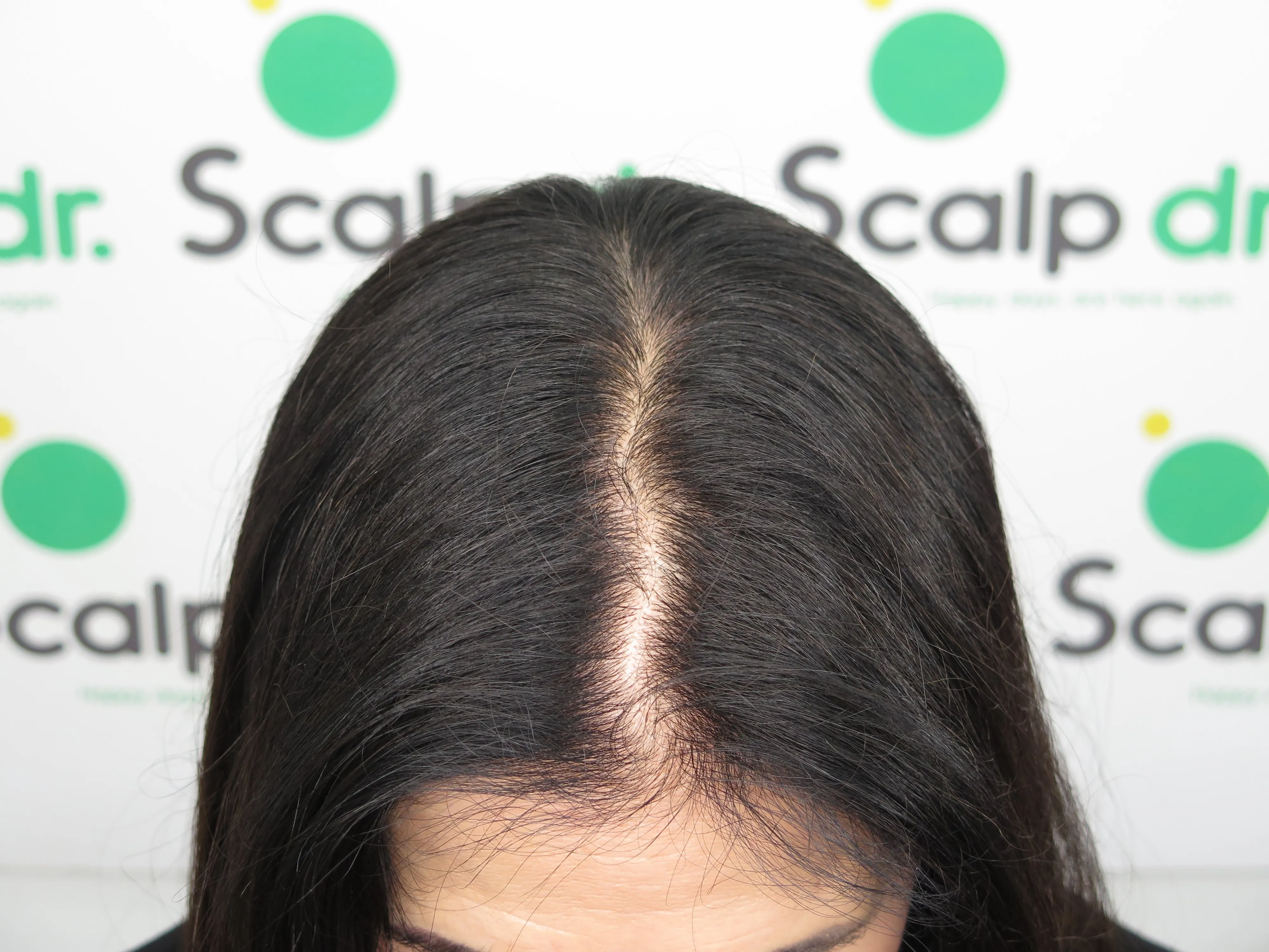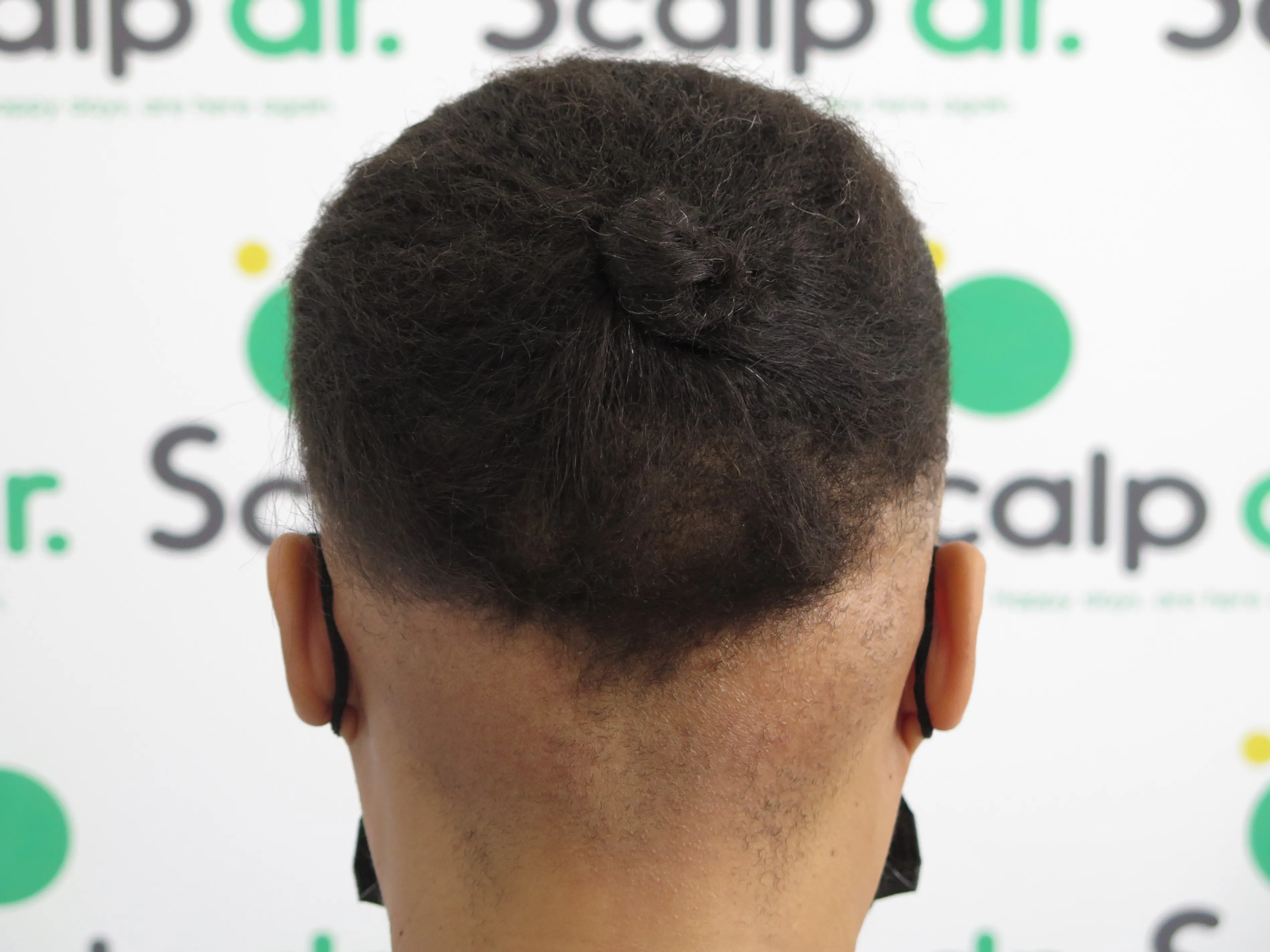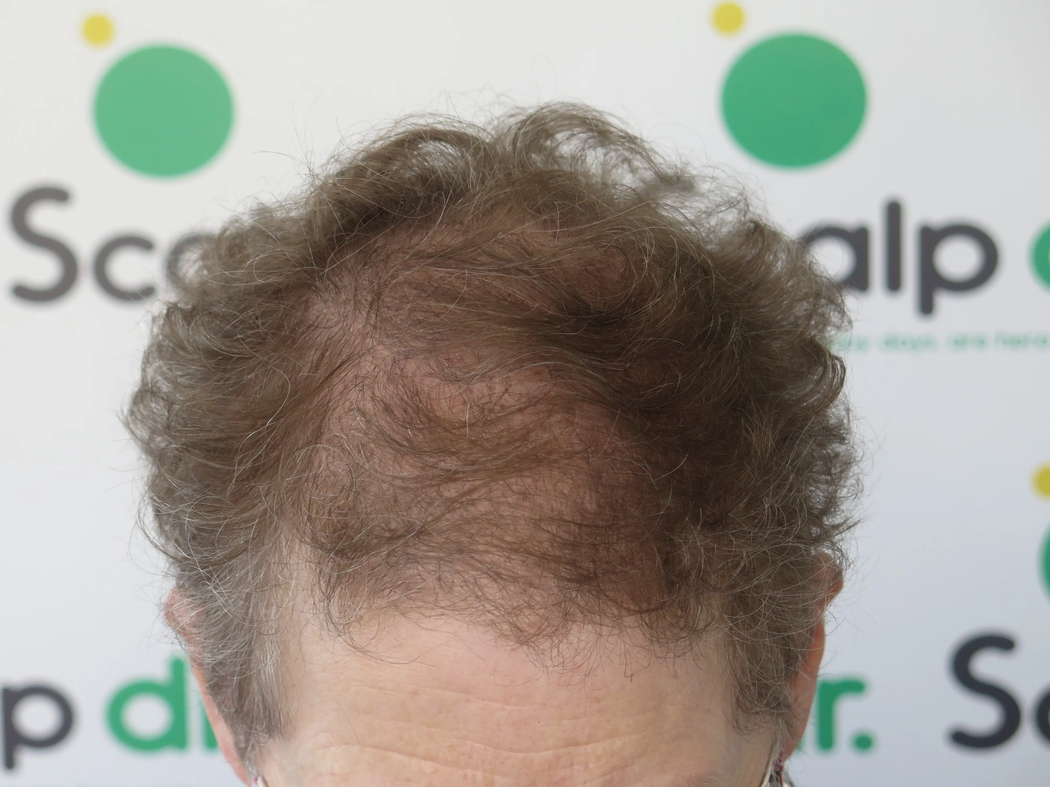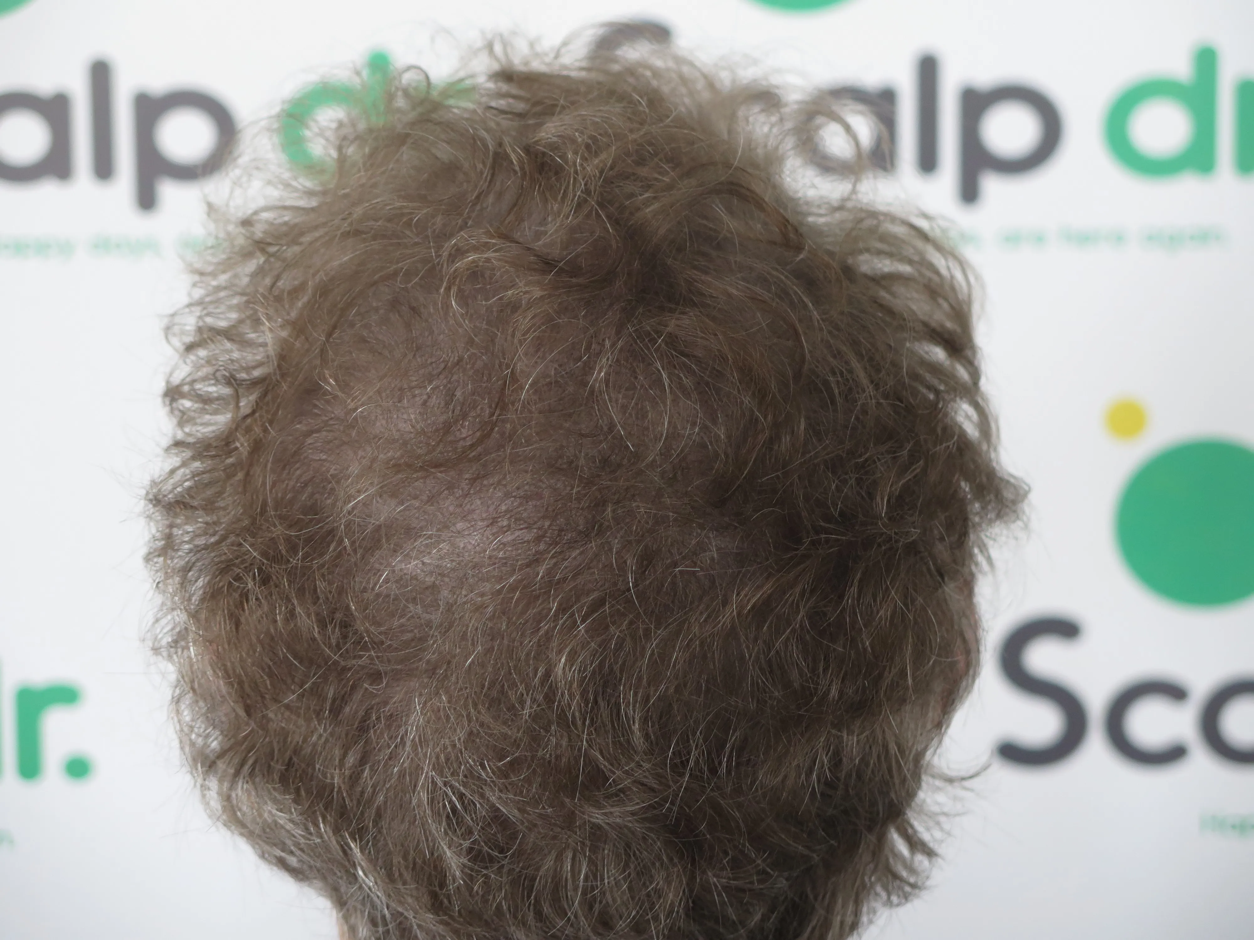 A density treatment is covering the areas of the scalp that are exposed with follicle-like impressions that give the illusion of a more dense look with an overall tone which hides the lightness of the scalp showing through the existing hair.