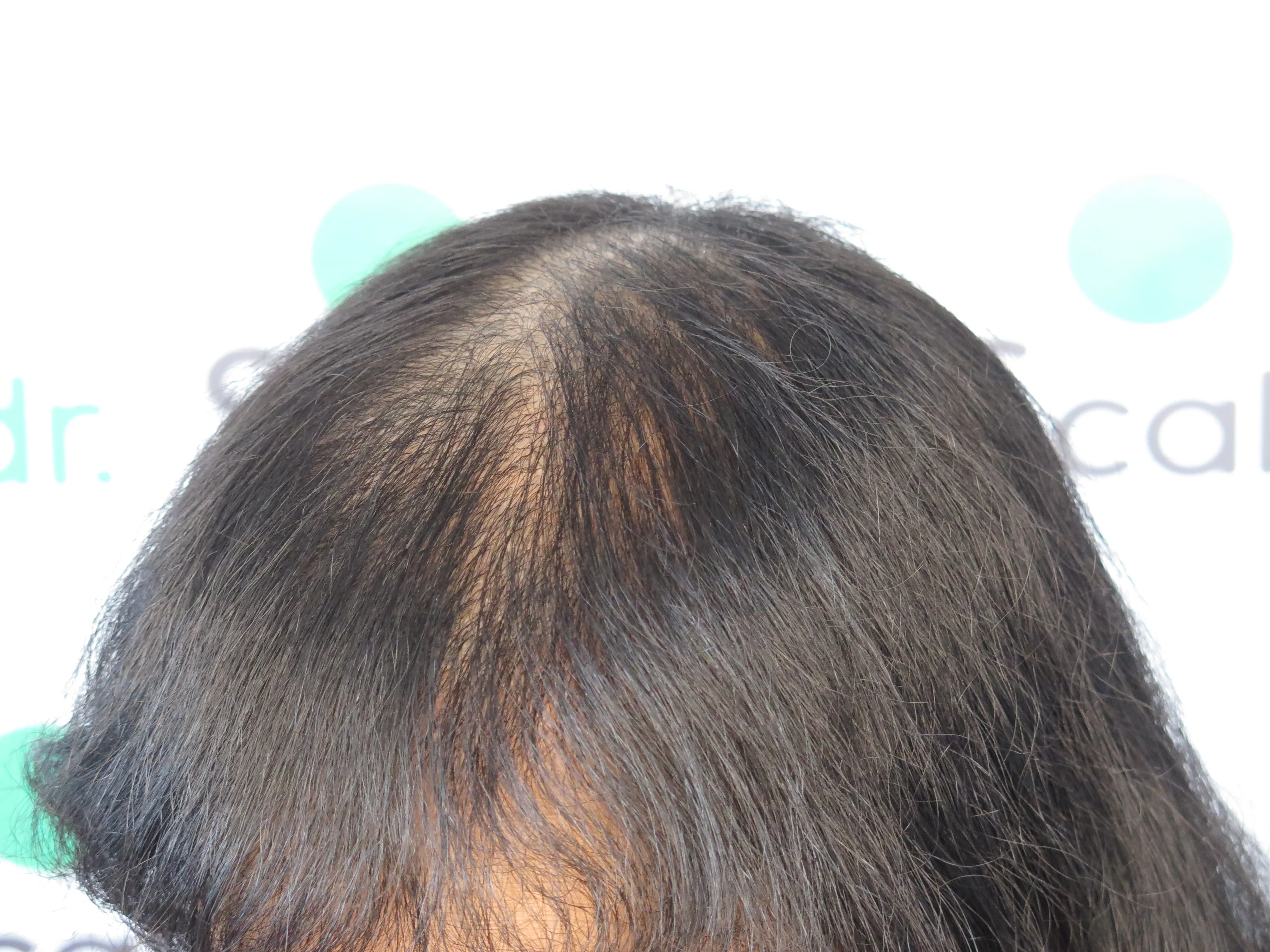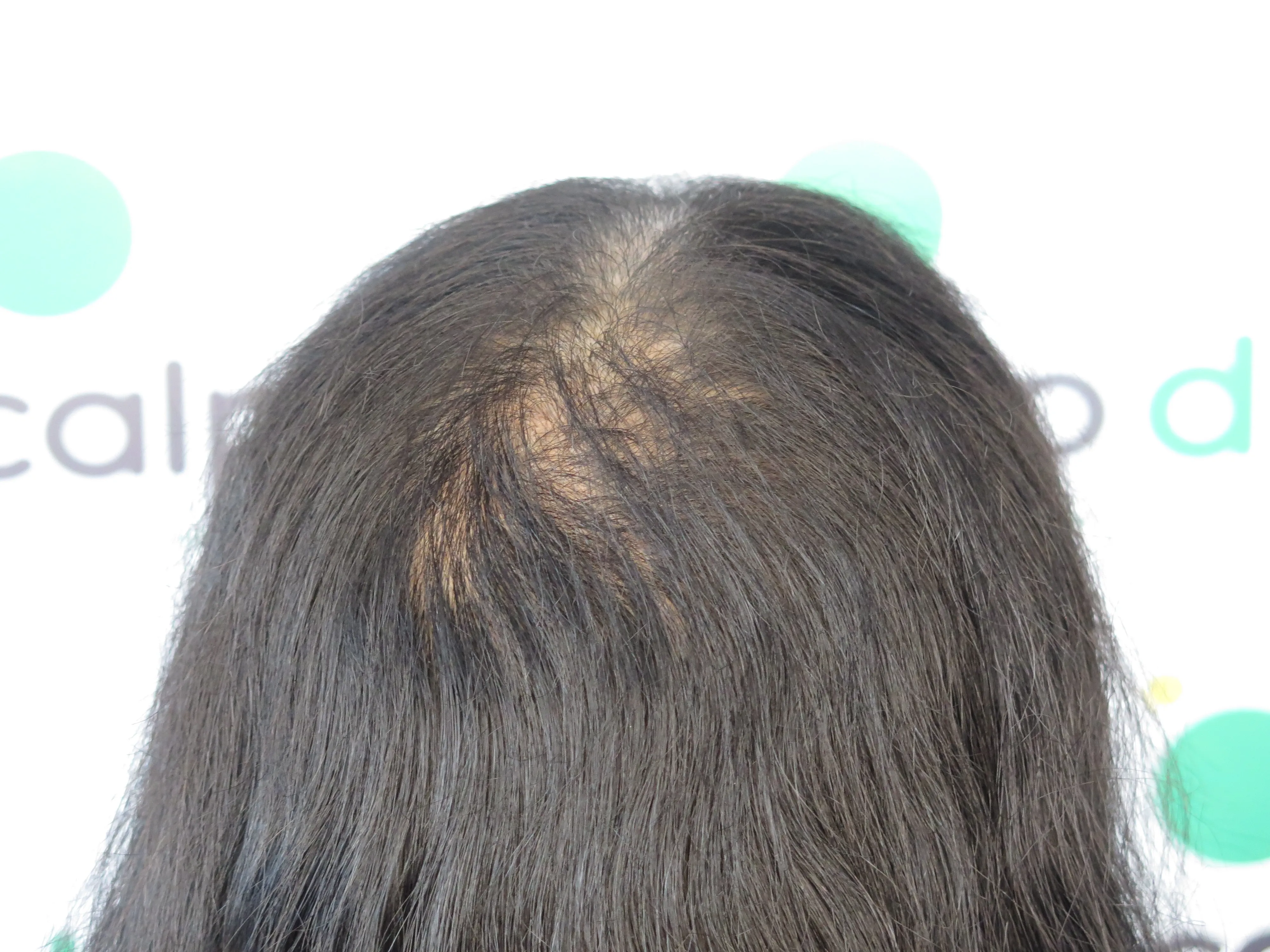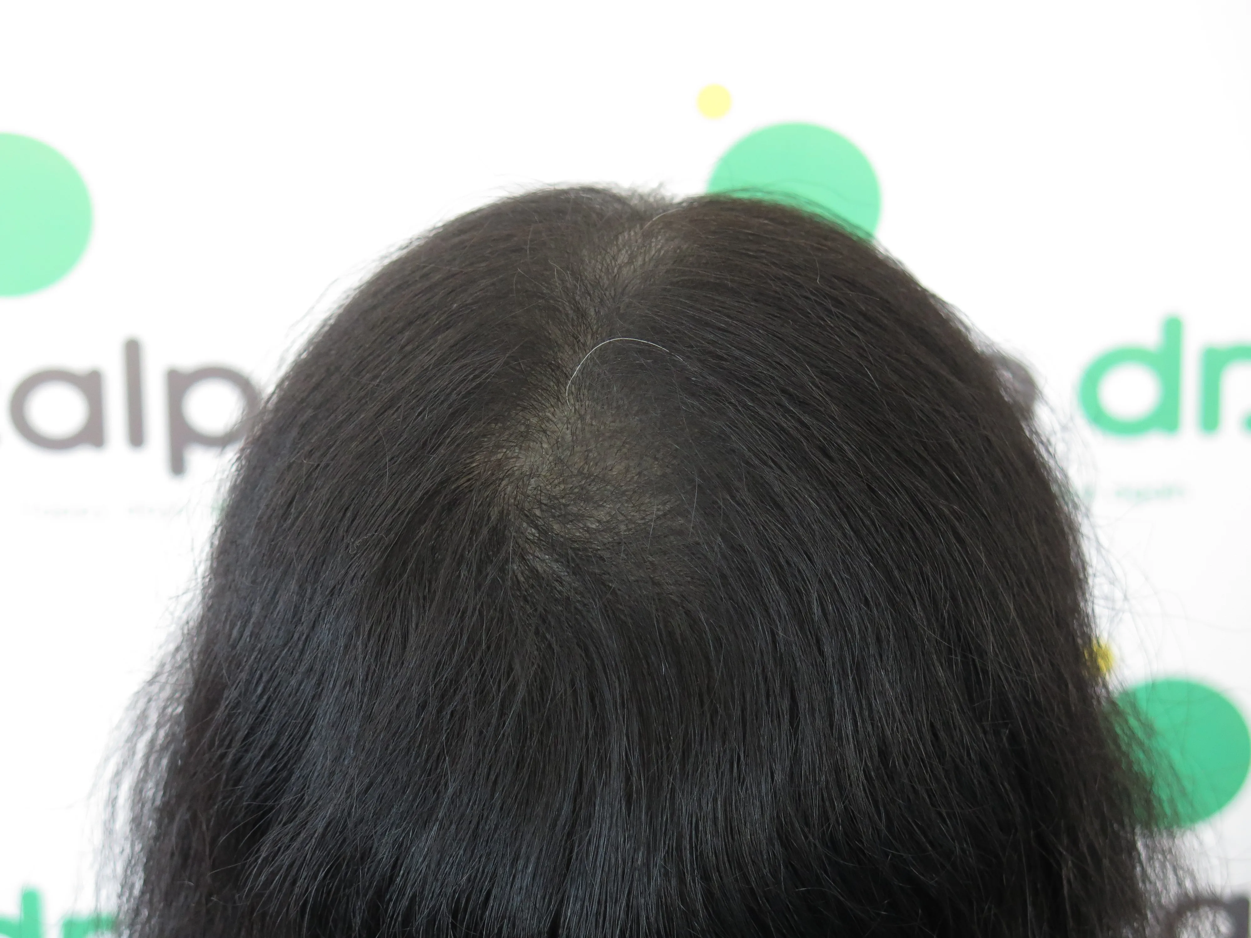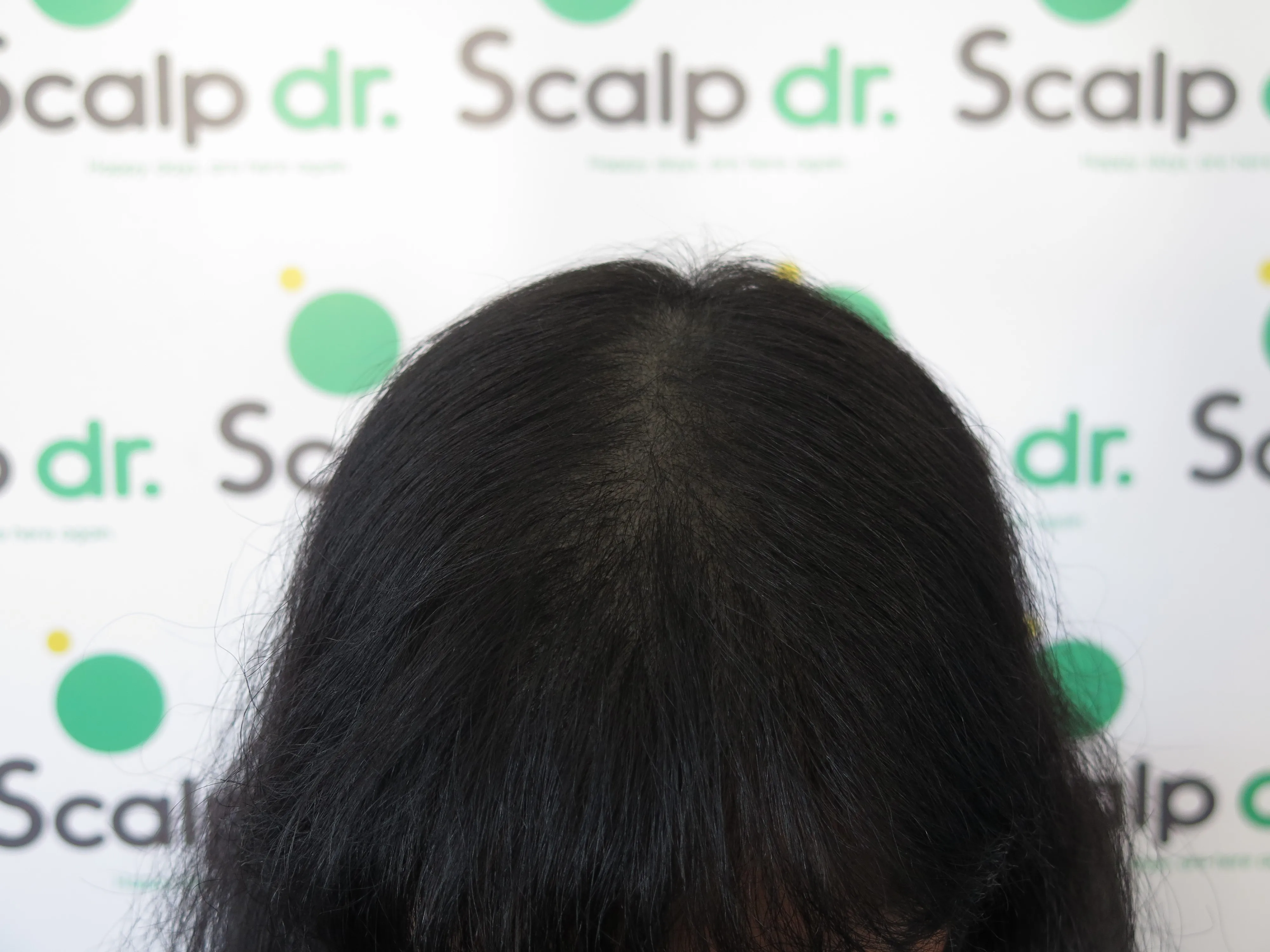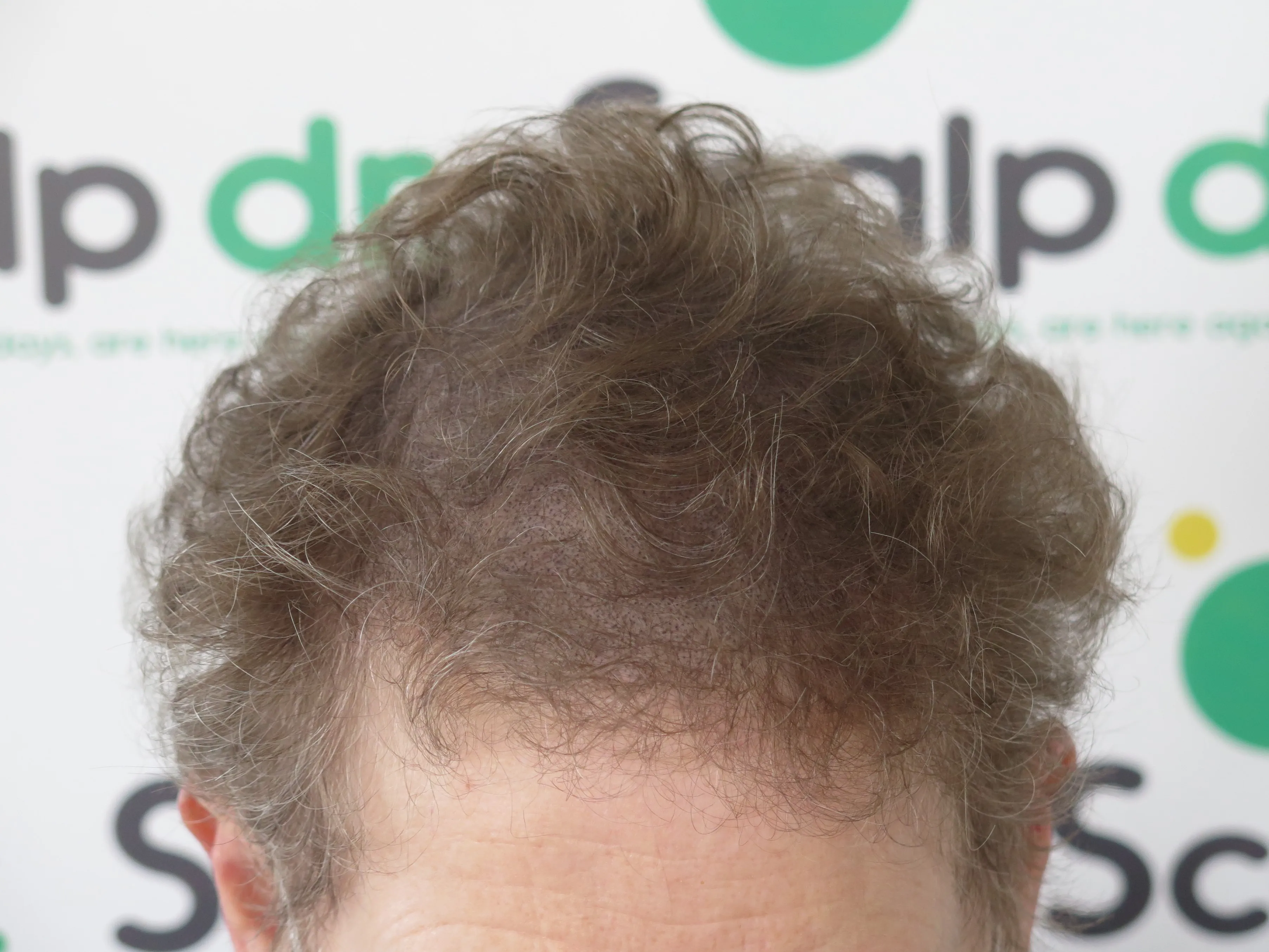 A density treatment is covering the areas of the scalp that are exposed with follicle-like impressions that give the illusion of a more dense look with an overall tone which hides the lightness of the scalp showing through the existing hair.