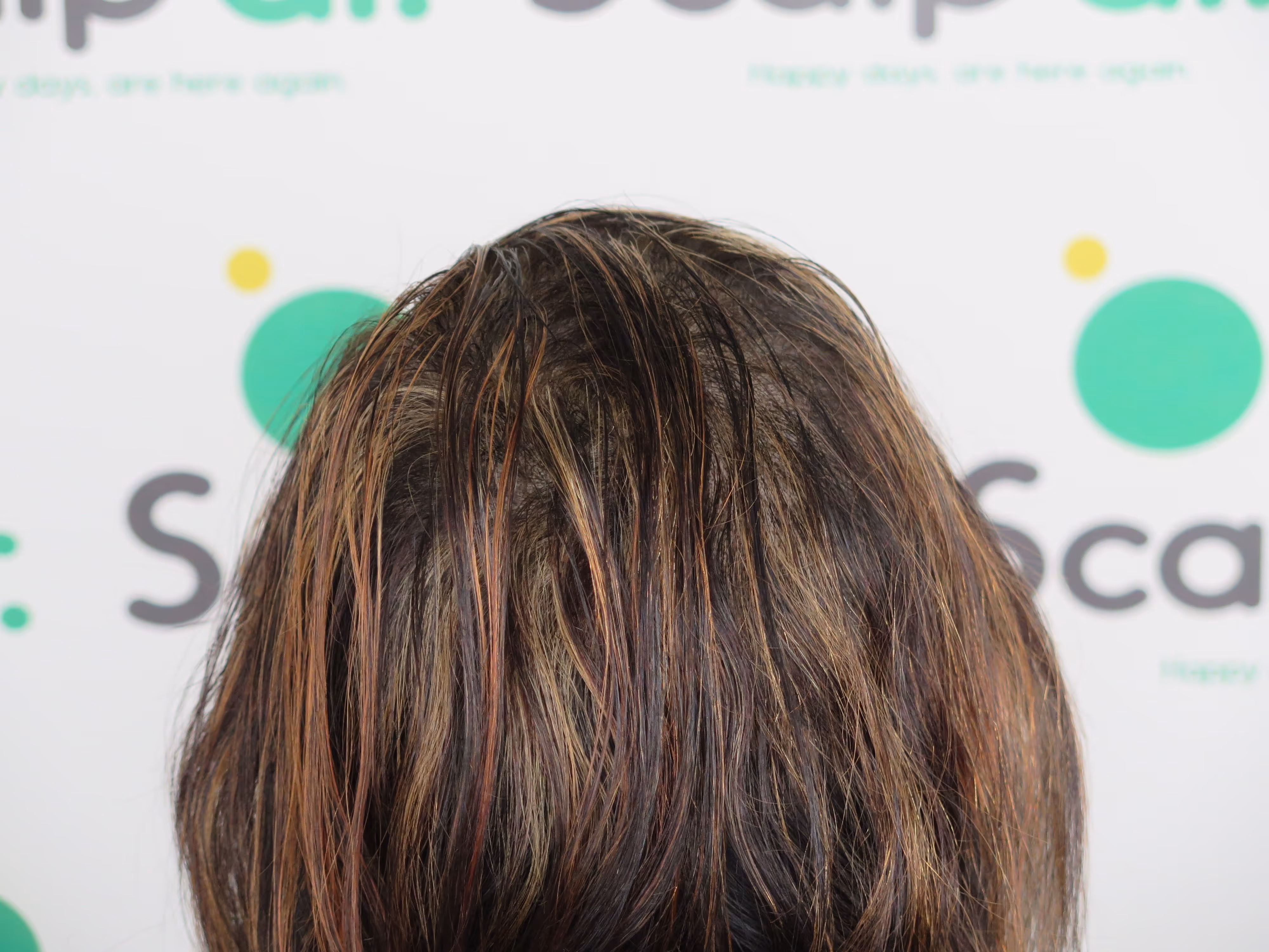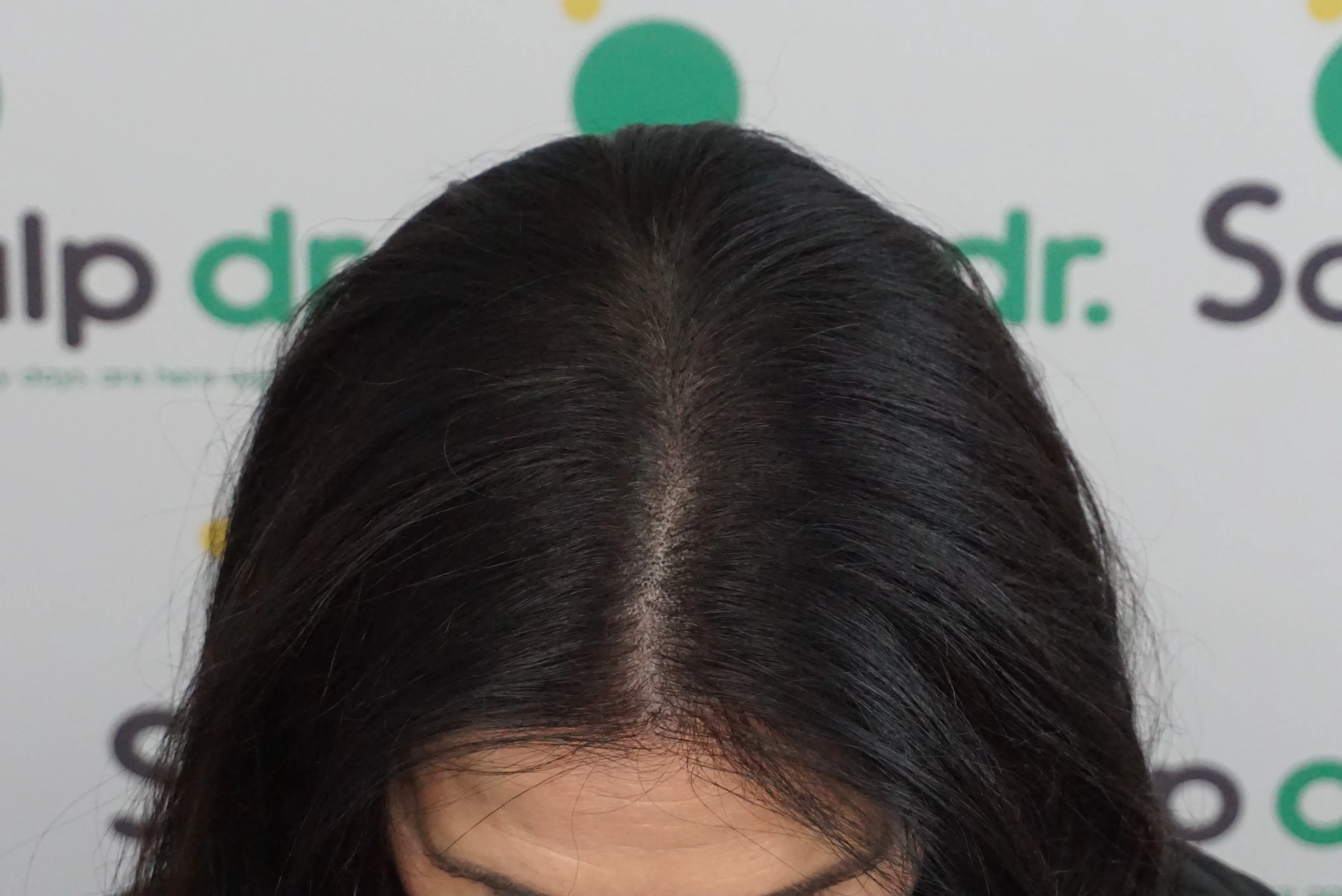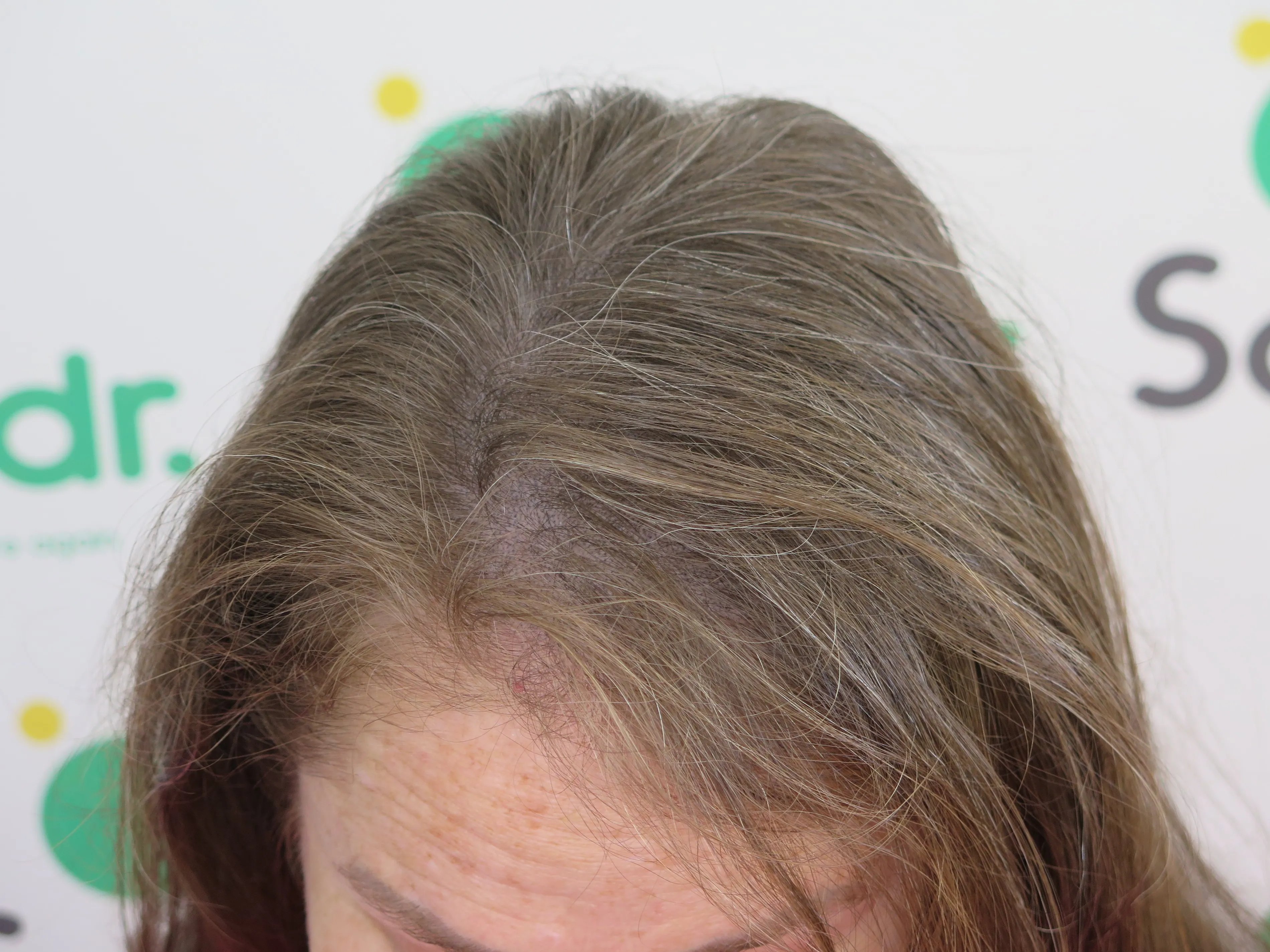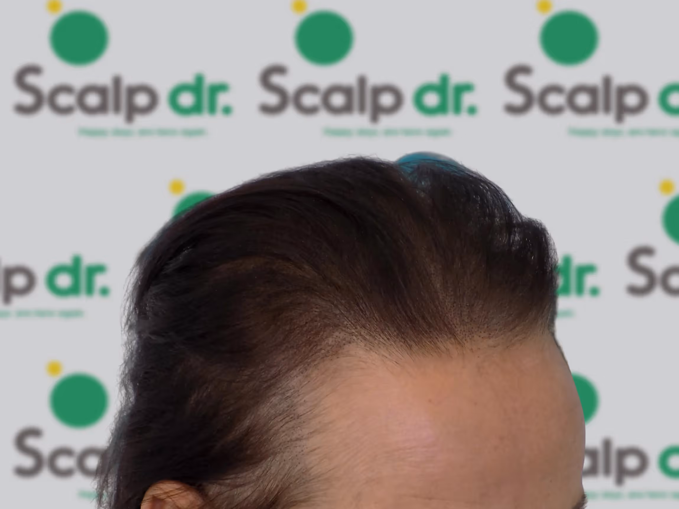 A density treatment is covering the areas of the scalp that are exposed with follicle-like impressions that give the illusion of a more dense look with an overall tone which hides the lightness of the scalp showing through the existing hair.