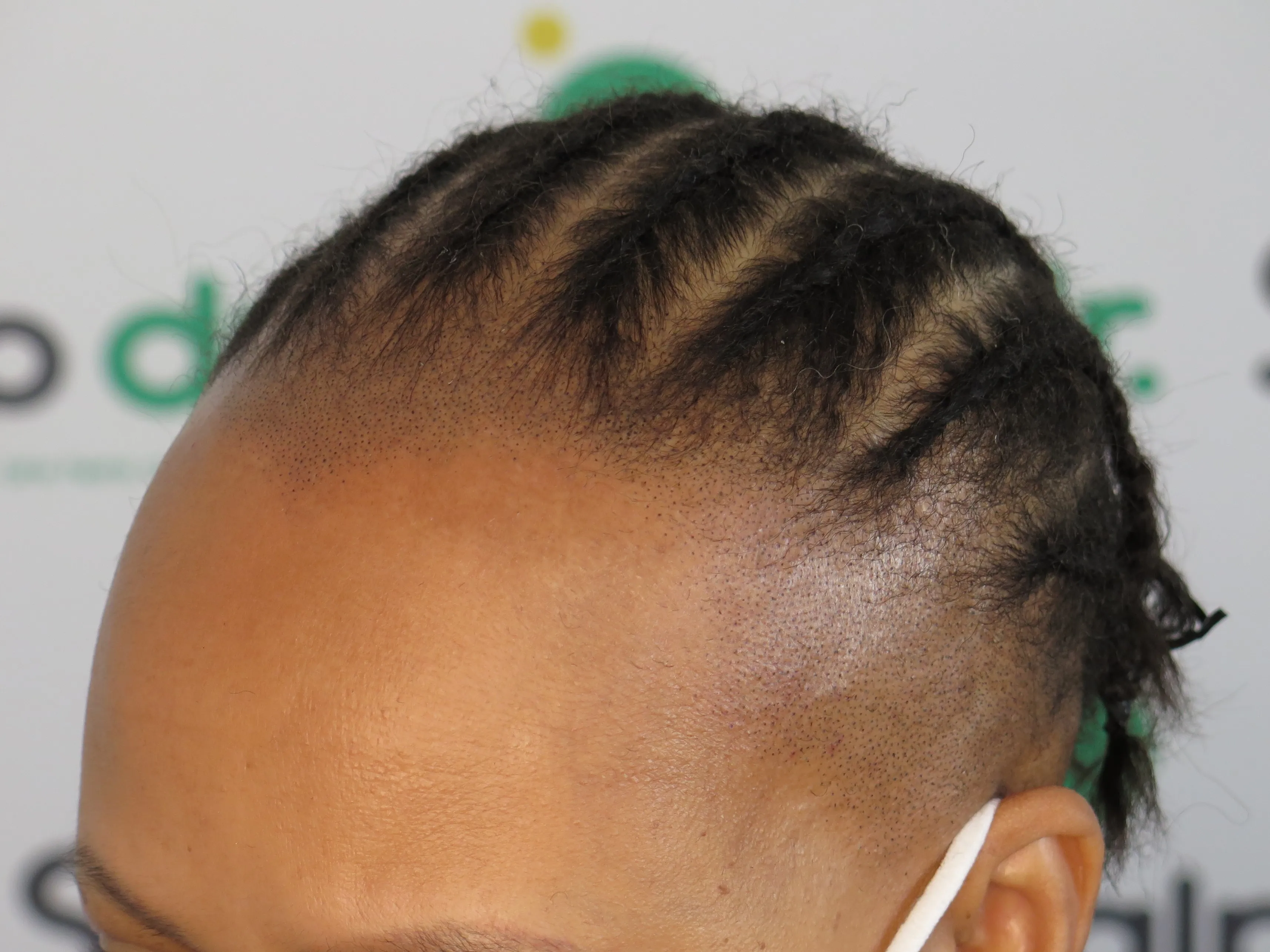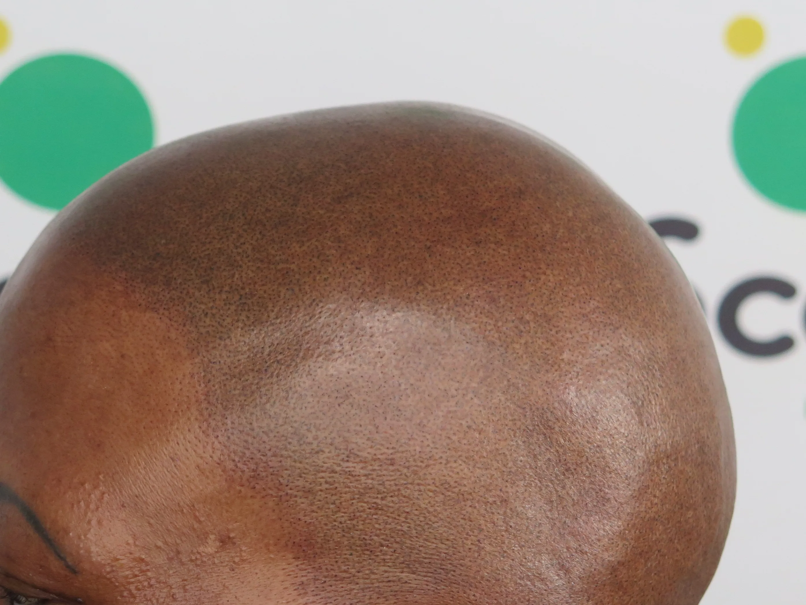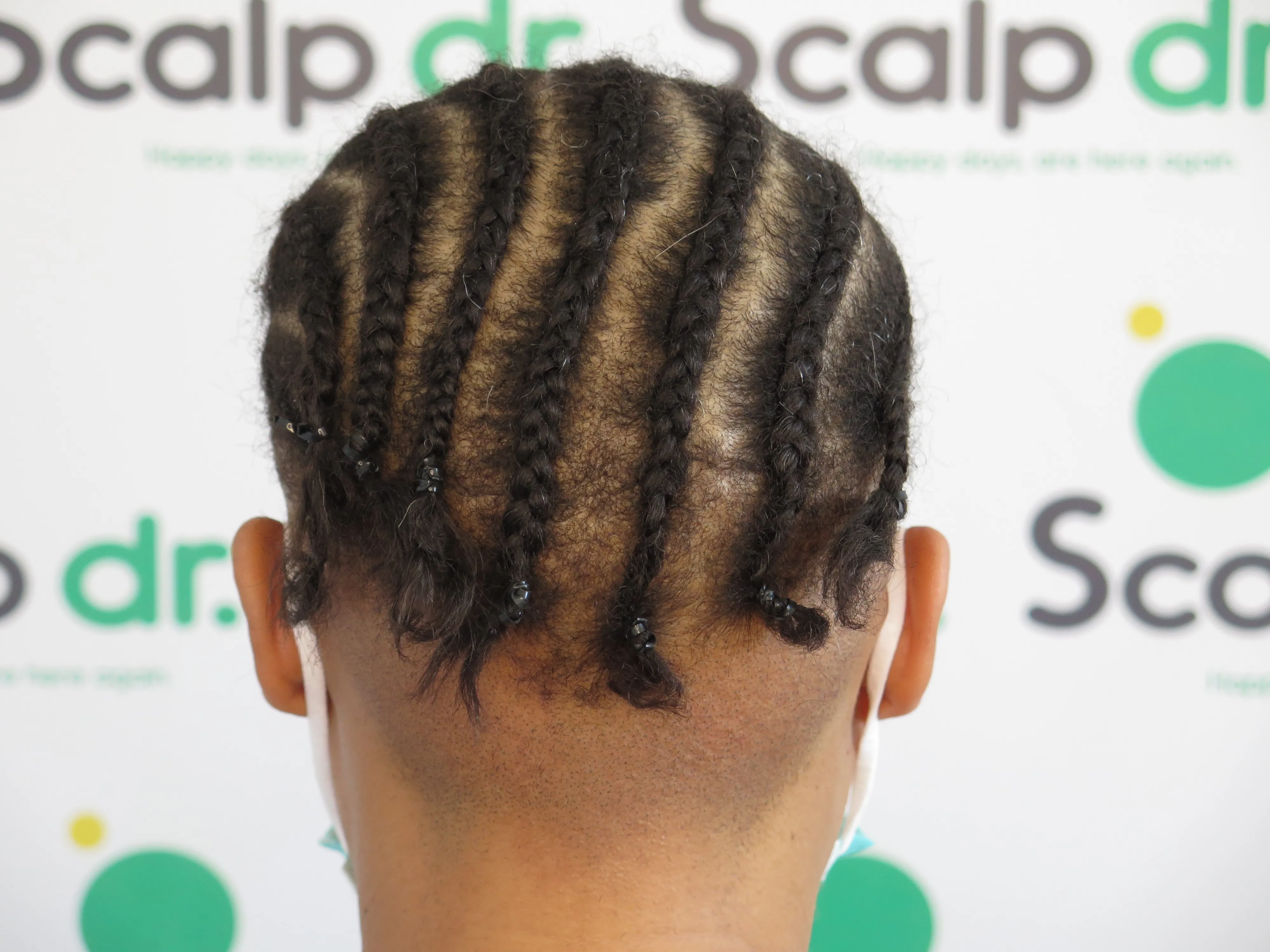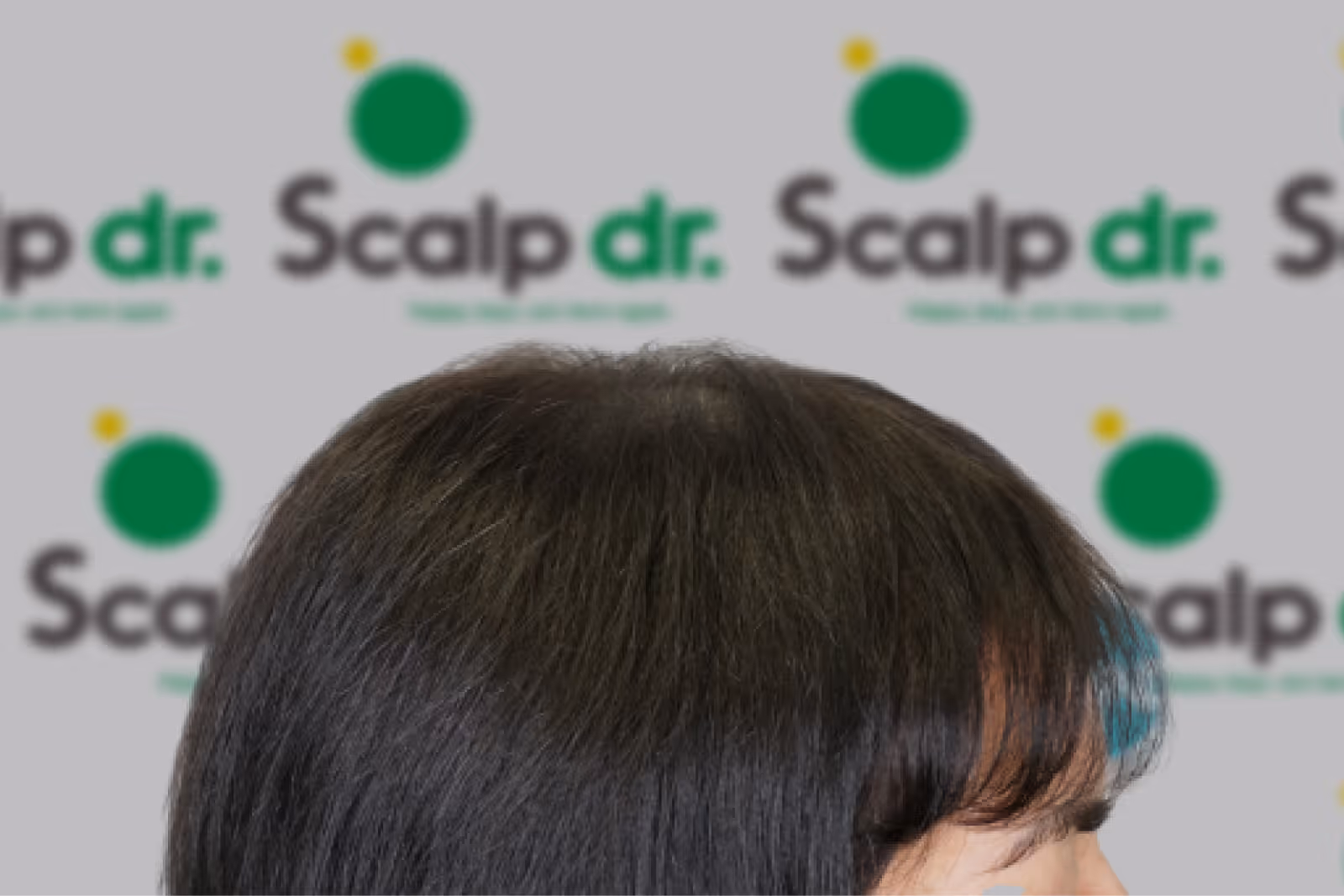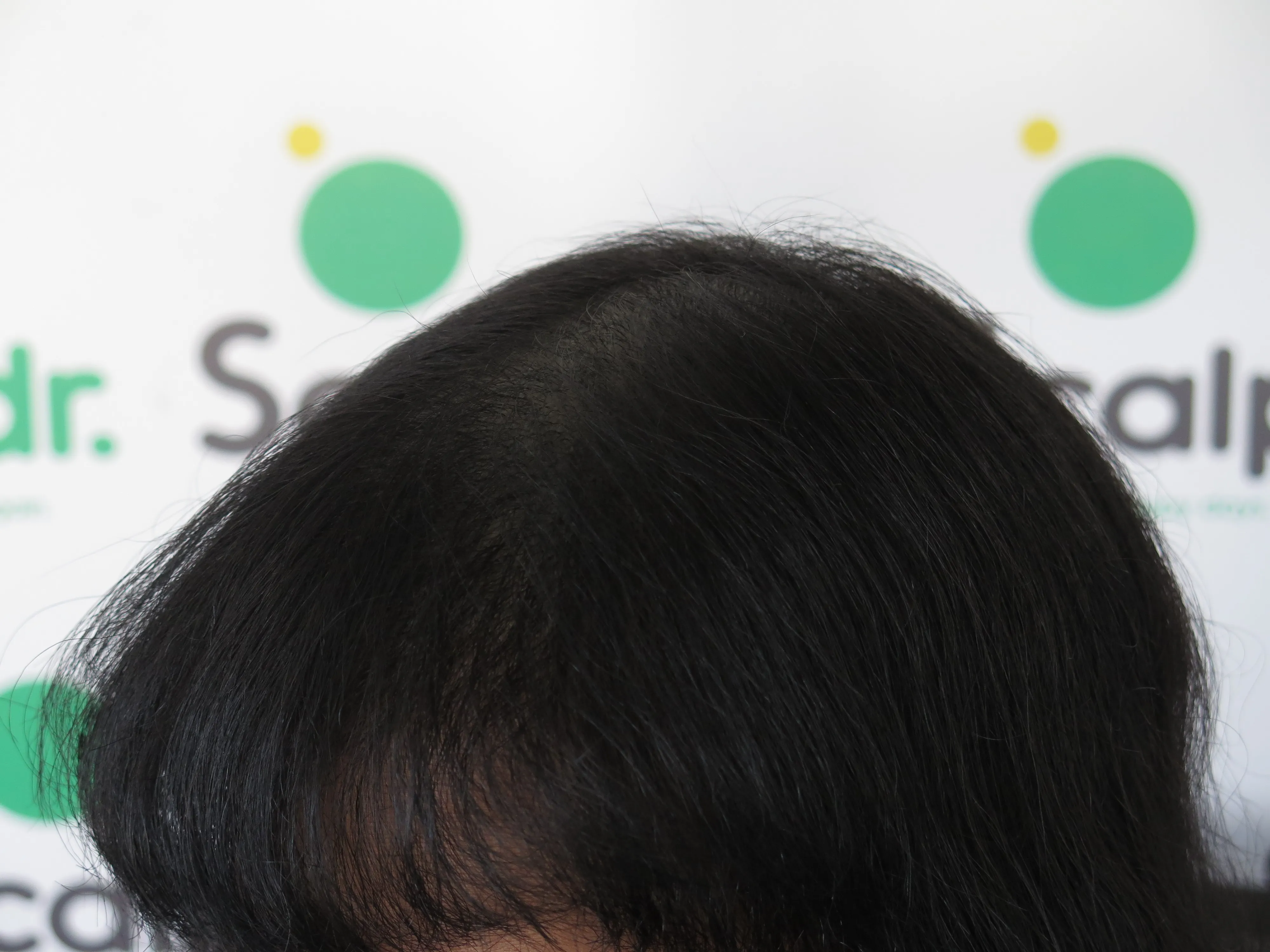 A density treatment is covering the areas of the scalp that are exposed with follicle-like impressions that give the illusion of a more dense look with an overall tone which hides the lightness of the scalp showing through the existing hair.